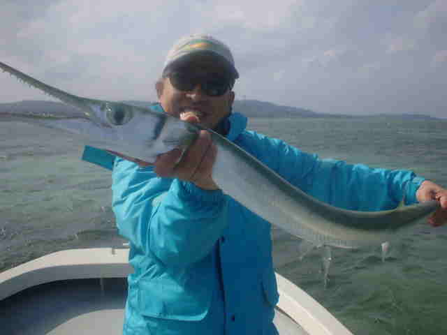 | 沖縄主張のあとに遊びに来られた野上さん。 この日も海は穏やかで半日ジギングをしました。 水深100mほどでカンパチやミーバイ狙いで シャクルとすぐにヒット!! サメが多いから早く上げようねと私が言った瞬間に ”ゴツゴツ”と何だかやな予感・・・と同時に竿が 水面に突き刺さり軽くなる・・・ 上がってきたのはミーバンの頭のみ。 ポイントを移動後シャクルとすぐにヒットするが、またまた シャークアタック、オイオイまたかよ。でまた移動そしてまた ヒット、そしてまたシャークアタック・・・ ヒットする魚すべてサメの餌食になりサメの為に釣りをしている みたいでどうしようもありませんでした。 釣れて大丈夫なのは中層でヒットするスマガツオでした。 |