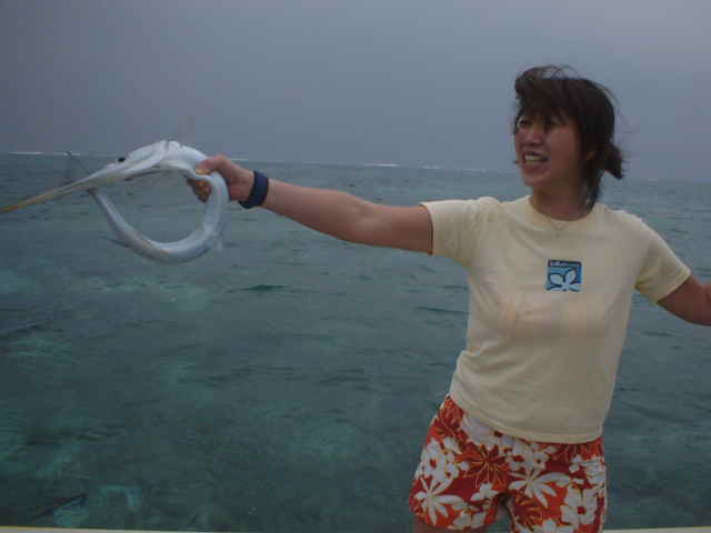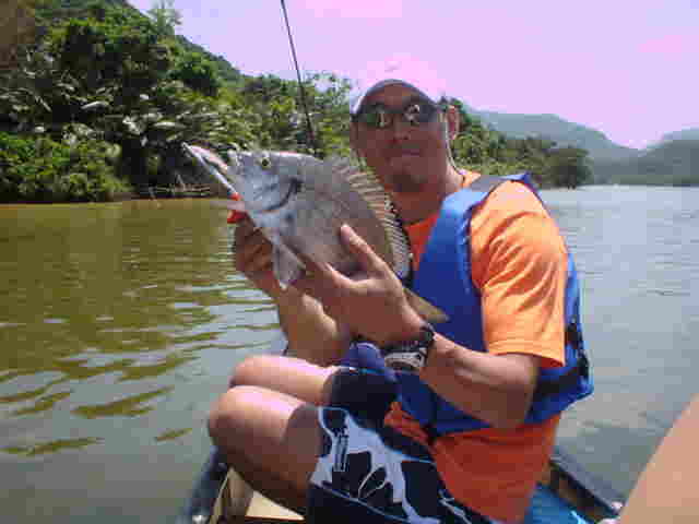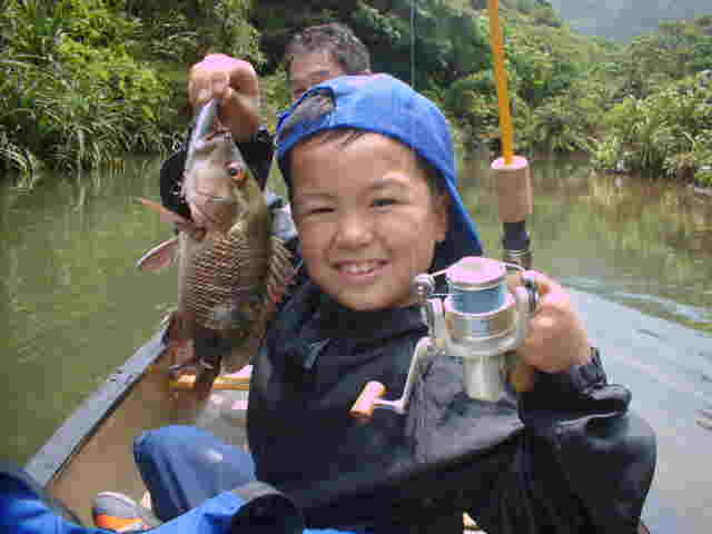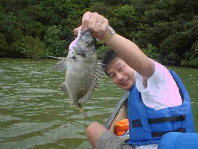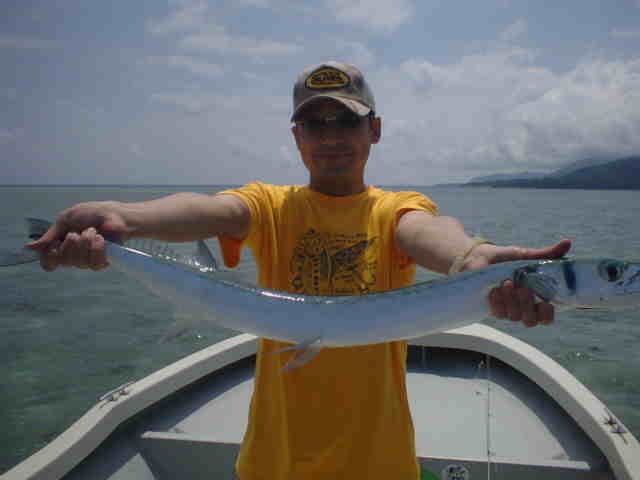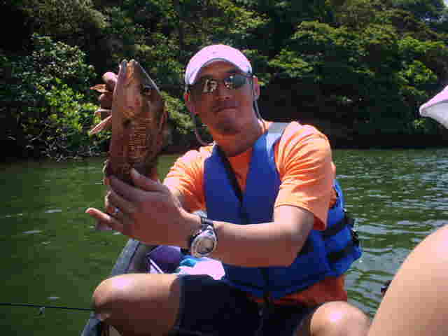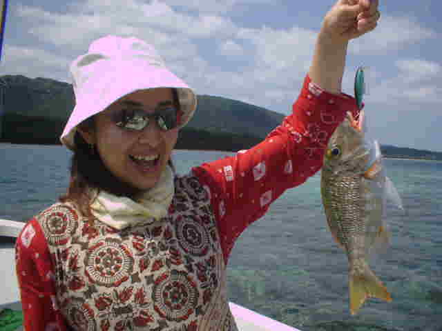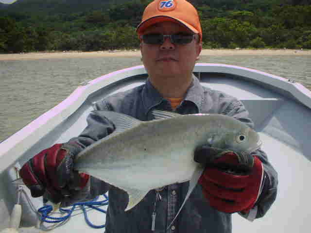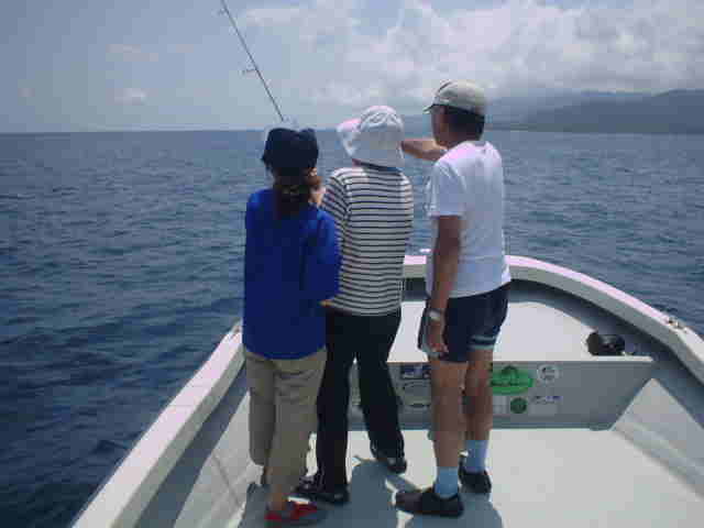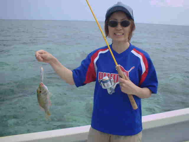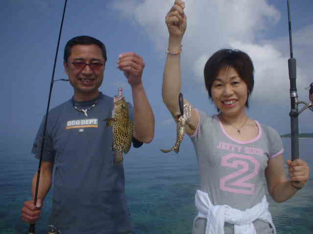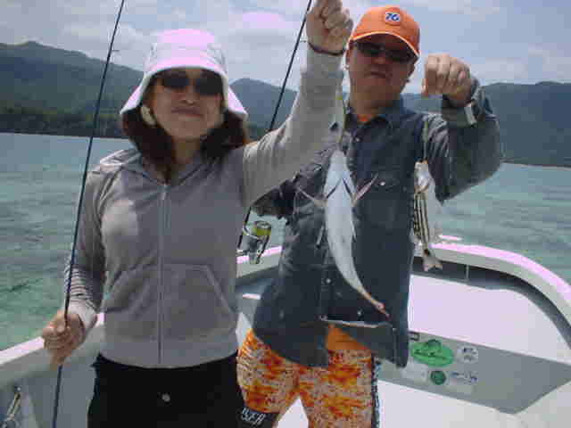 | 年4回西表に来ている棚橋さん夫妻。いつもはダイビング三昧だが子どもの頃にやった事のある釣りを、 是非したいと言うことでチャレンジ!! ひととうり遣り方を教えると、すぐに釣れおはまりモードのご夫妻。 ダイビングもいいけど釣りもいい物ですよね。 |