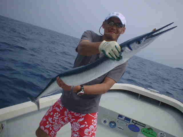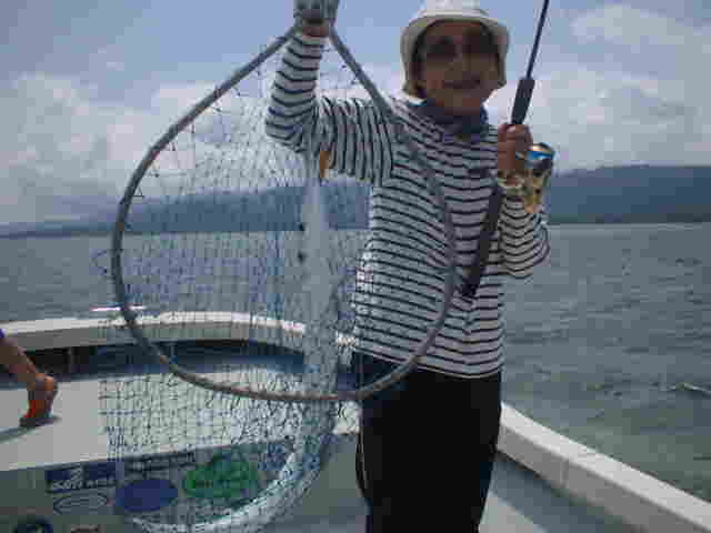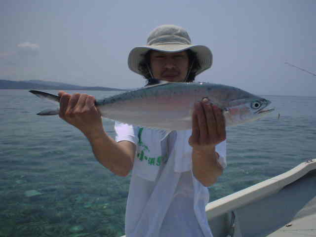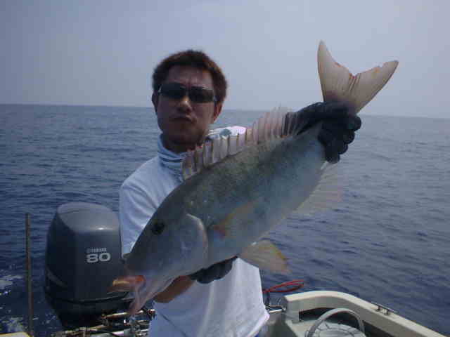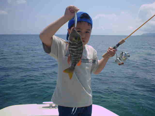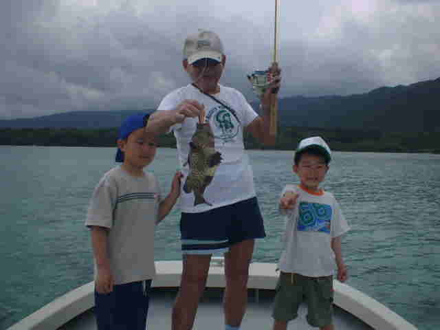 | おじいちゃん・おばあちゃん・お父さん・お母さん・お子さん リーフで家族釣り対決!! 皆さん頑張りました。いきなりおじいちゃんに良形ミーバイが ヒットし、ご機嫌モード。まけじとおばあちゃんがダツをかけ 大興奮。お母さんもお子さんも釣れ、お父さん大満足。 |