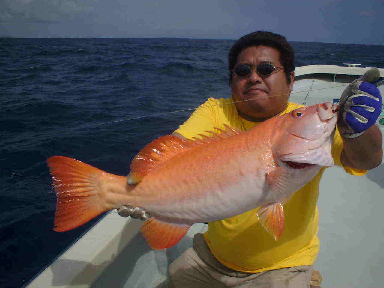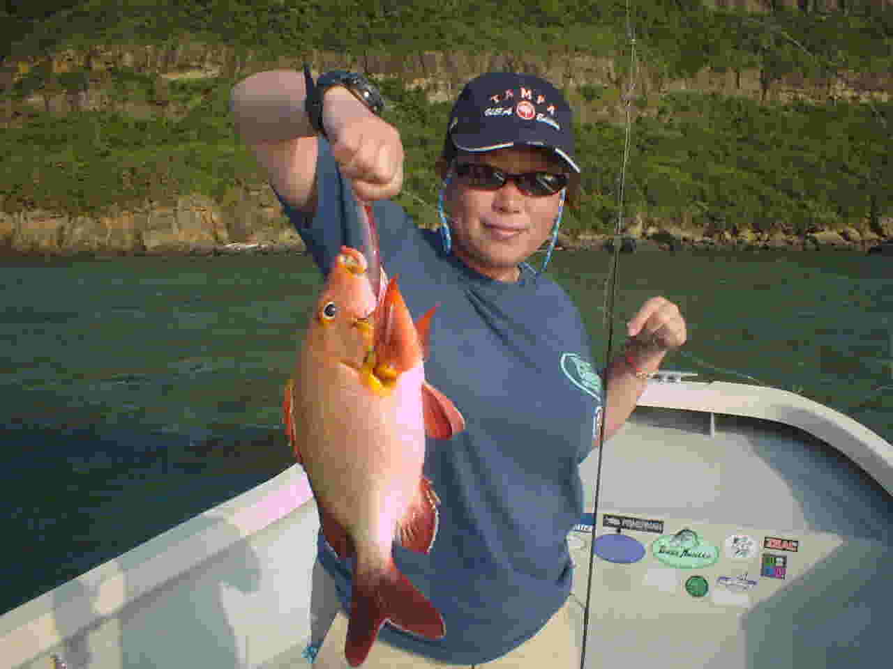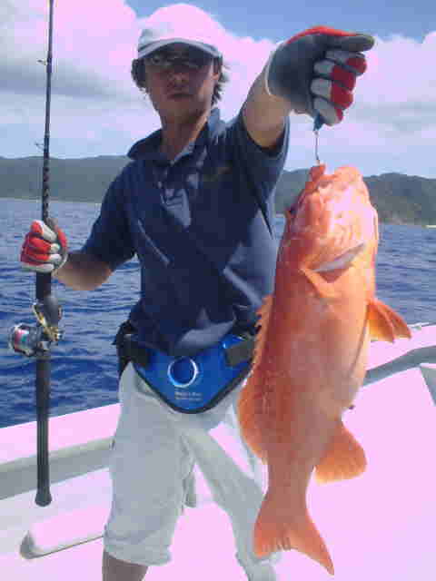| 沖縄本島から新婚旅行。 本島でも釣りをするがルアーではまだ釣った事が無いという事。 なかなかルアーでは釣れないらしいですね。同じ沖縄なのに魚の数やサンゴの種類、海の綺麗さにすごい驚いていました。「これが沖縄さ〜〜」と、沖縄産まれの 方に言われると何だか複雑ですね〜〜。 |