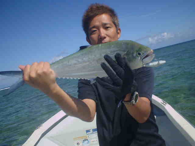 | ミーニシの季節風がきつく、波3m〜4m。 GTメインの釣行でしたが、天候不良で1日目は川へ。 キャストがなれるにつれ、チヌが面白いように釣れました 釣るのが夢だったユゴイも釣れ、戸田さんご満悦。 最終日ようやく海も落ち着きGT狙い、朝一でさわちゃん にGTがバイトしかしのらない。 風裏を選びながらポイントを移動したが夕方まで、GTらしきバイトはなし。夕方ここしかないと言うポイントでさわちゃんにGTヒット!!さすが西表では何匹も釣っているので、余裕のファイトで無事キャッチ。そして次は戸田さん。ルアーをキャストしてワンジャークでGTがヒット!! すかさずさわちゃんが戸田さんを支えに入りファイト。 慎重にポンピングして無事キャッチ。 これがファーストGTの戸田さん、おめでとうございます。 今度はサイズアップ、さわちゃんは目指せ30kGTだね |