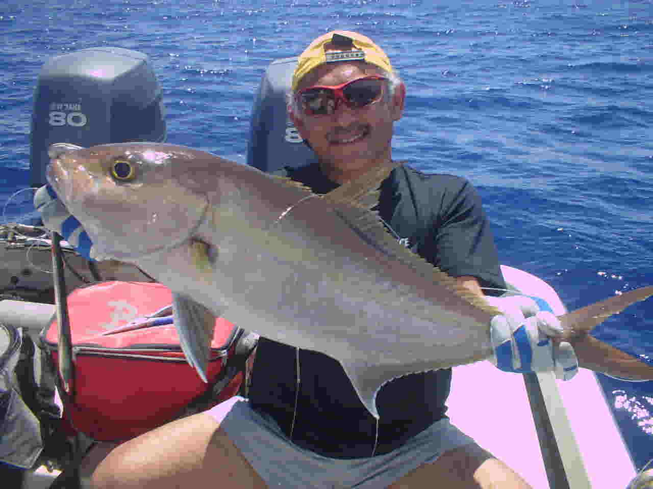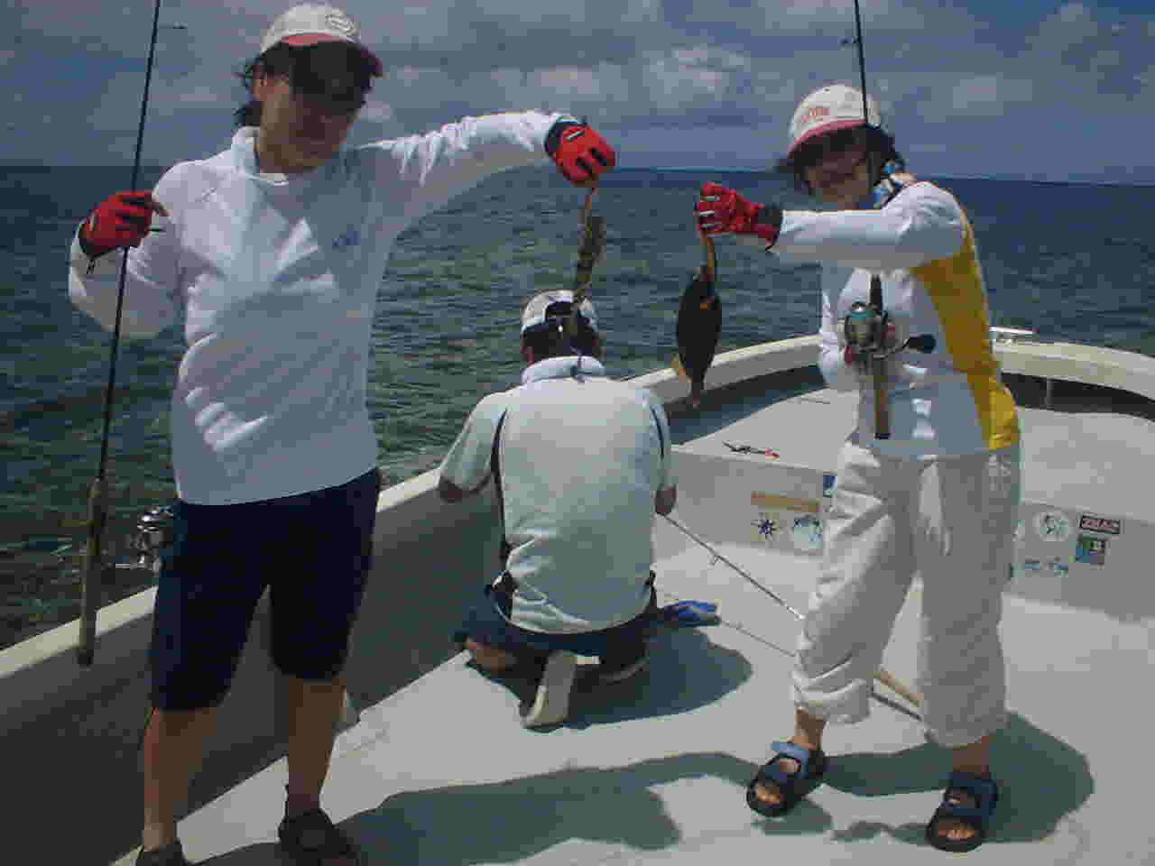 | 釣り好きファミリーの竹味様。 毎年西表に来て釣り三昧の毎日。 さすが皆さんお上手で、次から次えと釣り上げ何匹釣ったか 分からないくらいです。 しかしダブルヒットはあるもののトリプルがなかなか出来ない・・・ お父さん早く釣っての声に、あせったお父さんライントラブル・・・ 寂しそうな後姿のパパでした。 |