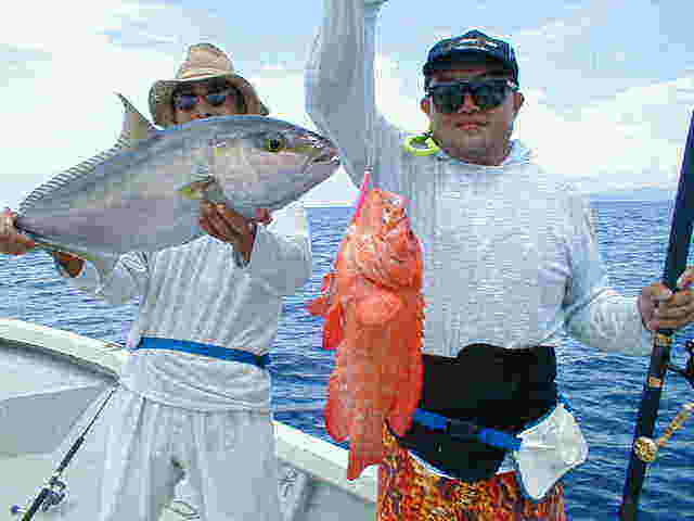 ダイビングと釣りを楽しむ皆さん、リーフの小物釣りから始まり 最近はジギングも初め、どっぷり西表病に掛かっています。 今度はGTに初挑戦するそうです。 |