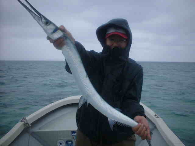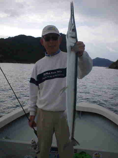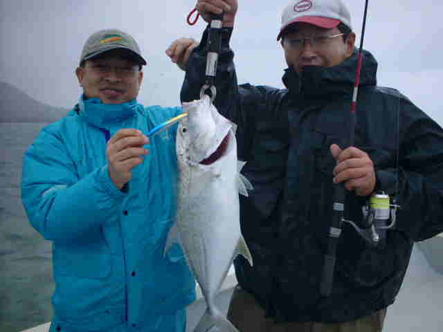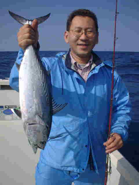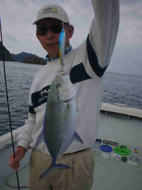 | 沖縄主張のあとに遊びに来られた野上さん。 この日も海は穏やかで半日ジギングをしました。 水深100mほどでカンパチやミーバイ狙いで シャクルとすぐにヒット!! サメが多いから早く上げようねと私が言った瞬間に ”ゴツゴツ”と何だかやな予感・・・と同時に竿が 水面に突き刺さり軽くなる・・・ 上がってきたのはミーバンの頭のみ。 ポイントを移動後シャクルとすぐにヒットするが、またまた シャークアタック、オイオイまたかよ。でまた移動そしてまた ヒット、そしてまたシャークアタック・・・ ヒットする魚すべてサメの餌食になりサメの為に釣りをしている みたいでどうしようもありませんでした。 釣れて大丈夫なのは中層でヒットするスマガツオでした。 |