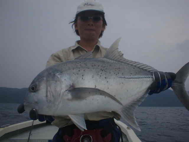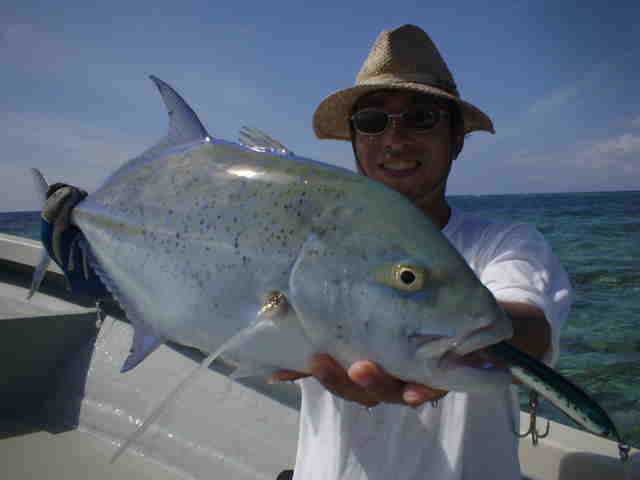 | ただいま究極のサイトゲームにおはまりモードの平田さんグループ。 リーフにあがってきたGTをサイトで狙うエキサイティングな釣り。 しかしそんなに甘くないのがこの釣り、今回は特にデカGTがヒットする。 中には10kクラスがレッペにバイトしてくるが、船を鬼フォローしても取れない・・・ タックルを強化しジギングロッドにPE3号で挑んだがロッドをへし折られてしまった。 結局取れるのはこのサイズ、しかし引きはさすがアジかなり楽しいですよ。 ヒットポイントはリーフエッジからイン側50mのシャーローフラット。 GTは上げの潮インリーフにベイトを探しに入ってくる。 リーフエッジでかけてしまうと、秒殺でラインブレークしてしまうので、なるでくエッジから50mの所でかけたい。 ヒットポイントがよければ5kは余裕で取れるが、タックルは強化したい。 最低でもPE2号以上でそれに耐えられるロッド、ルアーは決してでかくしてはダメ。 ヒットルアーはTDペンシル・レッドペッパーなど。 腕に自信あるから是非チャレンジしてみては。 |