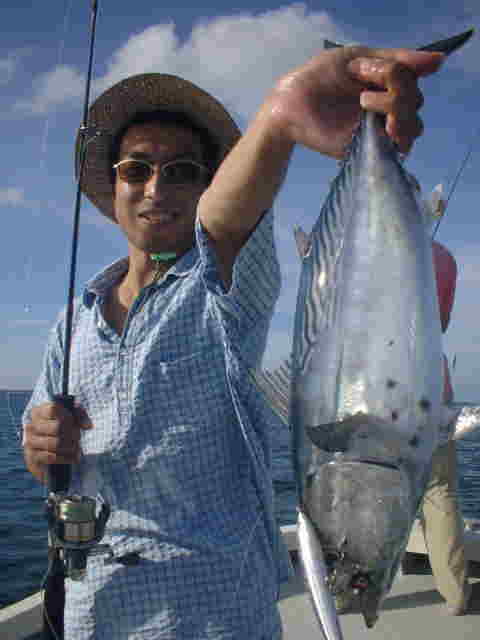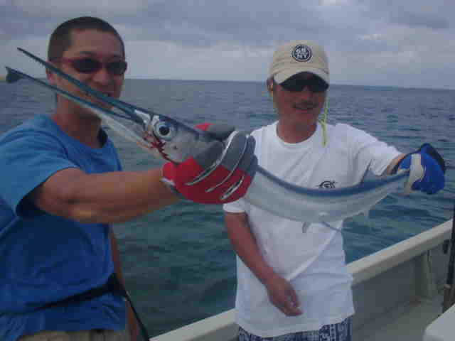 | 2日半のGT狙い。 固体によるがGTの産卵もほぼ終わり、こらからまた活性が よくなる時期。 初日の半日はノーバイトで終わり、2日目オガンへ。 潮、風共に合う時間を狙い、キャスティング開始。 気配ムンムンだが、GTのバイトがなかなか無く、周りでは カジキがジャンプしている。 午後ポイント移動後、ミヨシの河口氏のヒット、しかしすぐにはずれてしまった。ルアーを見るとGTの歯形がガッチリついている 最近はシーフロッグの様にフロントにワンフックという、ルアーが多く、非常に魚にもやさしい。しかしそのフックの大きさが重要で、皆さん大体3/0か4/0を付けてくる。 このサイズだと非常にのりが悪るい。やはり安心なのが5/0 6/0が理想で、ワンフックタイプのルアーはワンサイズ大き目のフックがお勧めです。 その後小さなバイトやデカマグロのチェイスなどがあったがキャッチには いたらなかった。 3日目島周りを攻める。 何ヶ所かポイントを攻めて行くと、かなかないいナブラを発見、河口氏が キャストするとすぐにGTがヒット。上がって来たのは小ぶりのGT. これで皆スイッチが入ったのか、その後山崎さんに待望のGTがヒット!! 慎重なやり取りで見事20k弱のファーストGTをゲット。 残すは入江さんのみ。ポイント移動後すぐにやる気満々のGTが入江さん のルアー目掛けてバイト。4,5回のチェイス&バイトにもかかわらず、 のぜきれなかった。 皆さん大変お疲れ様でした。 台風が心配されましたが、うまくそれてよかったです。 |