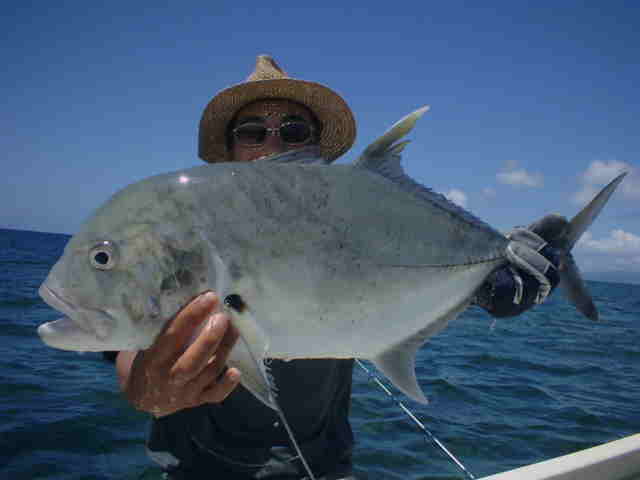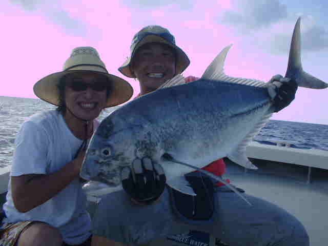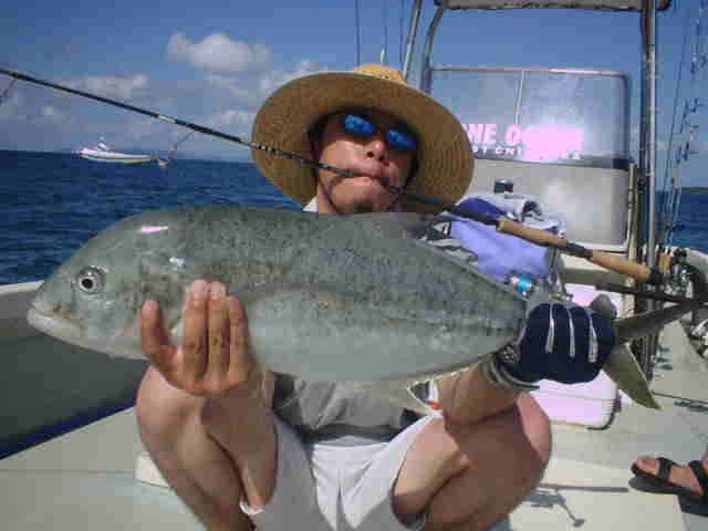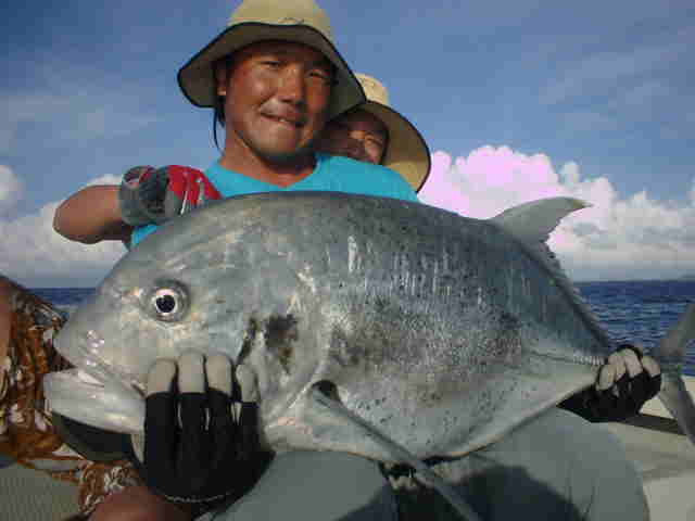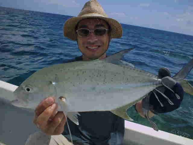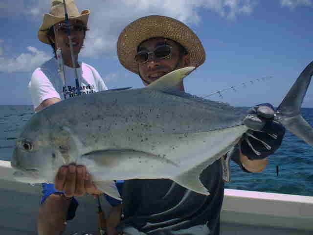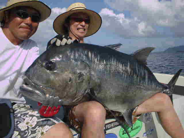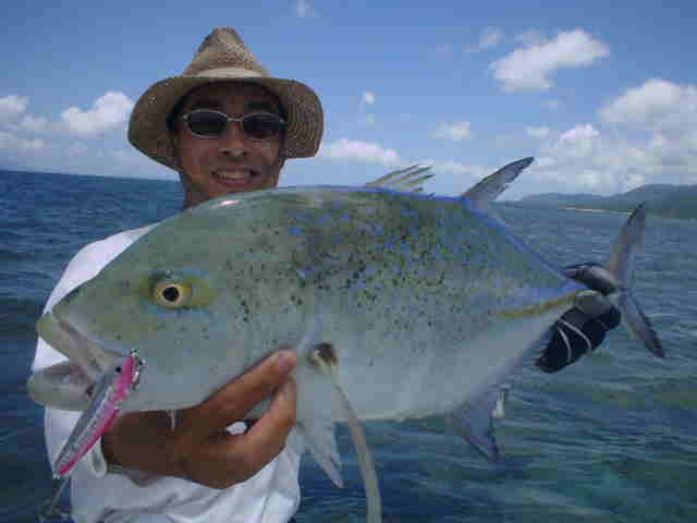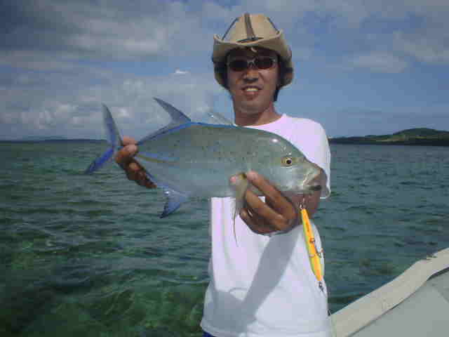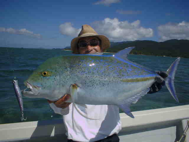 | 去年は台風直撃で1日しか海に出れず無念の西表釣行でしたが、今年は台風6号の通過直後でグット コンディションのGTゲームでした。 1日目台風のうねりが残る中GTゲーム、午前中数発の小さいバイトがありゴー君がイソマグロをキャッチ。 魚の活性はいい様で、その後も数発のバイトがあったが乗らない。そして夕まず目のラストポイントで、館山の共栄丸 の船長ヒロ君がファーストGTをゲット!!釣った瞬間室伏バリのおたけびで大喜び。 2日目はリーフのライトゲーム、あいかわらずリーフは爆釣モード!!カスミアジ・ダツ・フエダイ・ハタなどなど もう充分釣って夕方GT狙いで、ゴー君が10kGTをゲット、ポイント移動し一投目またまたゴー君にモンスターGT がヒット!!、必死のファイトでGT30kおめでとう。 3日目GT狙い、午前中ナブラ打ちでヒロ君にGTがヒット、しかしフックアウトしてしまった。ルアーの歯型を見ると 昨日の30kGTより歯型がでかかった。 そして夕方またまたゴー君にヒット!!もう慣れたのか落ち着いたファイトでGT20k!!これを見たゴー君父&ヒロ君 は真剣モードで最終ポイントを流す。やはり来ました、ゴー君父にヒット!!浅瀬を越し深場に行くかと思った 瞬間ラインブレーク・・・ 残されたヒロ君はあきらめず投げ続ける。最後の一流しドラマはありました。 強烈にルアーにバイト!!浅い為鬼フォローにはいり船の真下まで追いかけ、パワーファイトで見事GTをゲット!! 船上は大盛り上がりでヒロ君も感無量。 しかし釣りはホント最後まで分からない物です。皆さんお疲れ様でした。 |