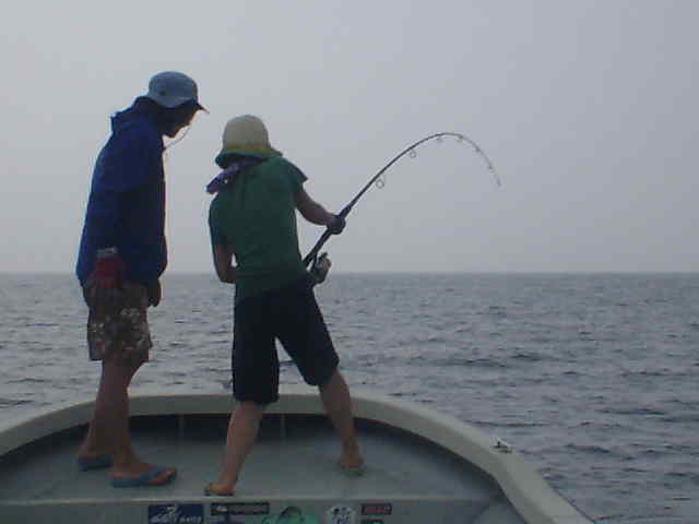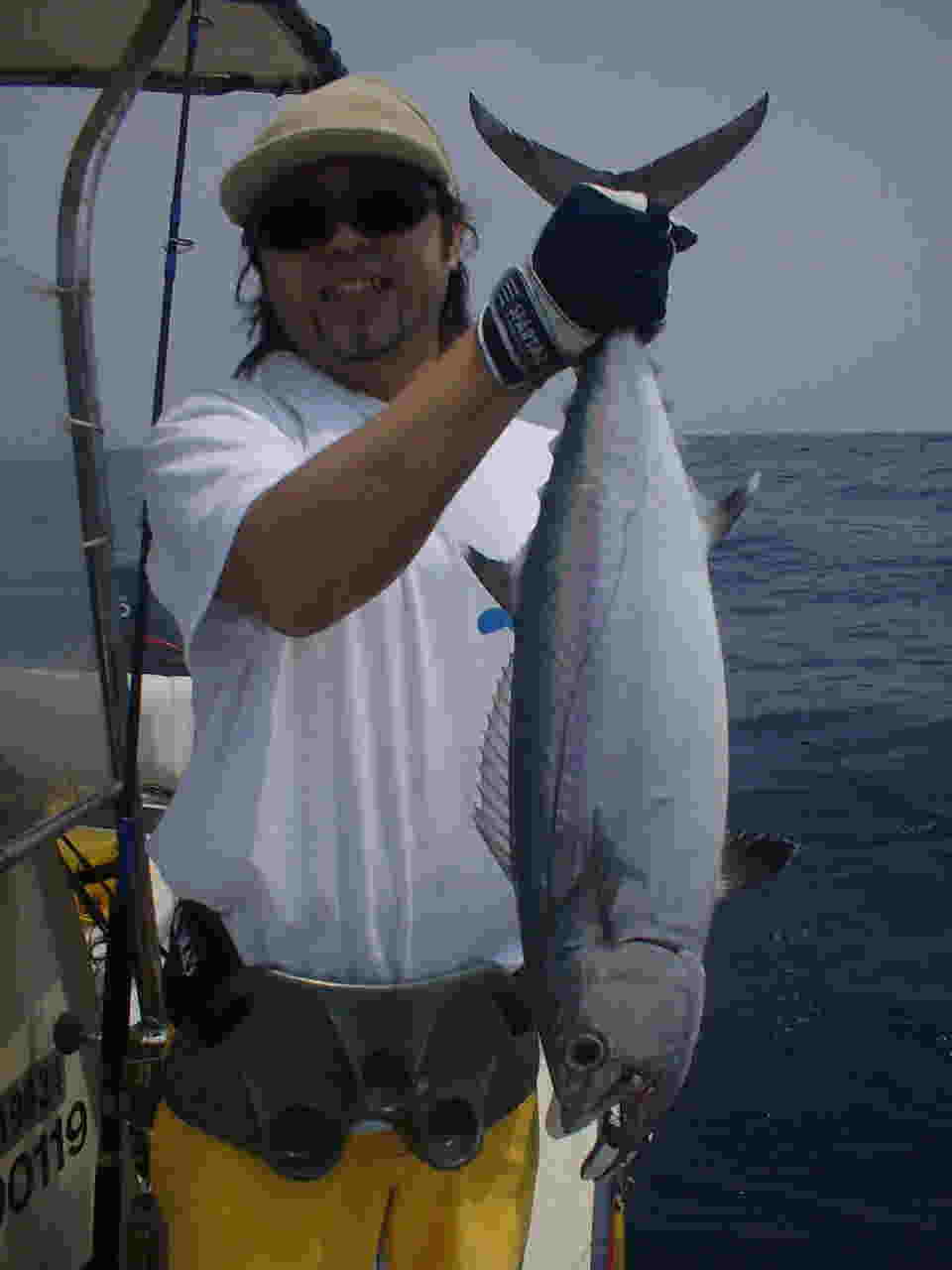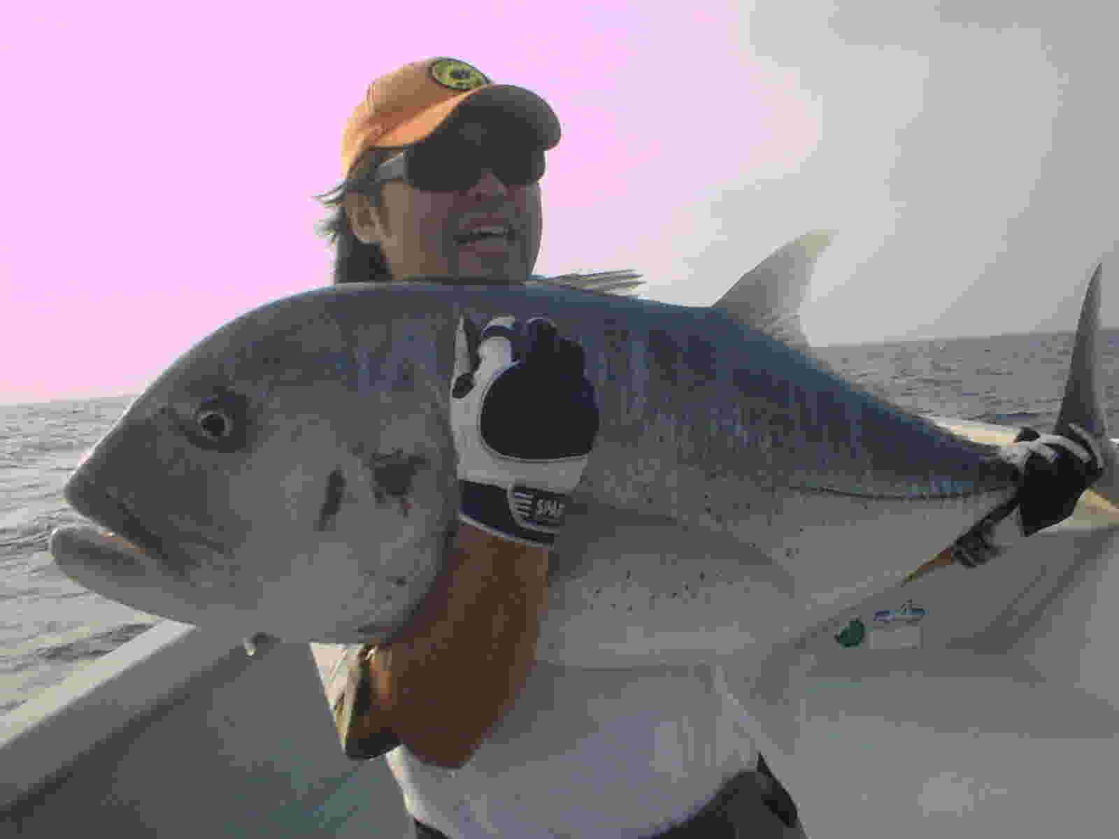4日間のGT狙いであったが、GTキャッチは1匹・・・・ しかしバイト数はかなりあったり、皆ヒットまで持ち込めた。 1日目午前中に戸田さんのペンシルにヒット、ずっこけながらも強烈フッキングしたが、ポンピングできずラインブレーク・・・。夕方も戸田さんに2尾のGTがチャイス&バイトしたがフックングまでいたらなかった。 2日目ポイント到着後、桑山さんサワちゃんとバイト、何故か乗らない。 次に戸田さんにもバイト、しかしまたのらない・・・。やっとサワちゃんヒット したが強めのドラグ設定もなんなく出され、フックアウト。その後も数回の バイトが皆にあったがラインブレークなどでキャッチならず。 3日目今日こそはGTの顔を見たい。午前中はノーバイトでいまいちの活性。午後リーフエッジ狙いで桑山さんにヒット、フッキング後慎重にポンピング 今度こそはと思った瞬間フックアウト・・・なぜ・・・・。 そのまま夕方まで反応が無く、最後の一流しでやってくれたのがサワちゃんでした。船べり近くでヒット、さすが経験者慎重なやり取りで見事 GT22kをキャッチでした。よかったよかった。 4日目まだ釣っていない3人はやる気まんまん、しかし無常にもGTは姿を 見せず、バラフエやダツの姿しか見れない。そして夕方待望のGTバイト。 桑山さんのトビペンに巨大GTがヒット!!物凄い水しぶきを上げ手前に走ってきた。すかさずフッキングしロッドエンドをギンバルにセットしさーポンピングだ〜〜〜と思ったら・・・・あらま〜〜またまたフックアウト。 GTFは難しい〜〜〜と思った釣行でした。 |