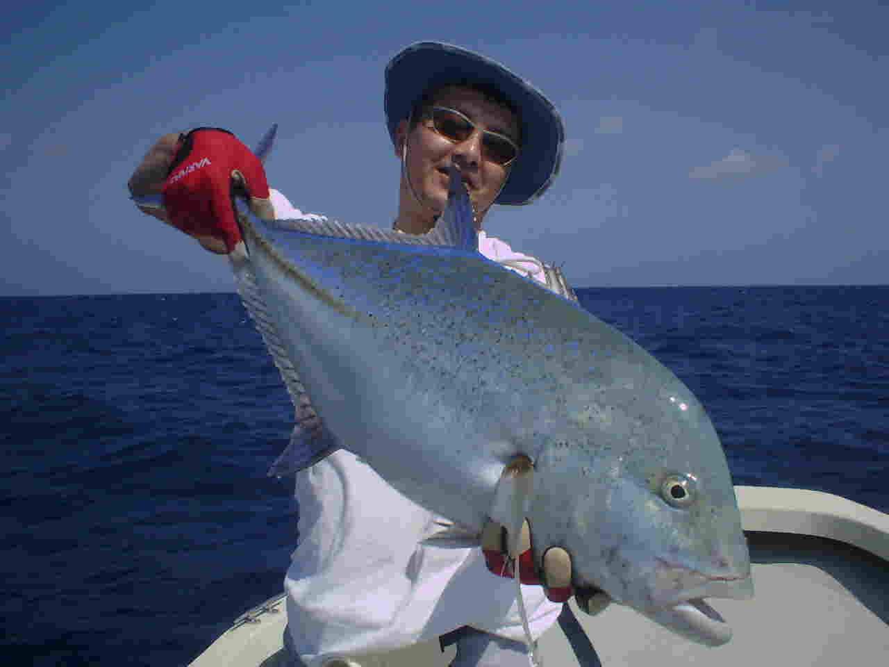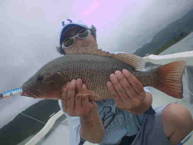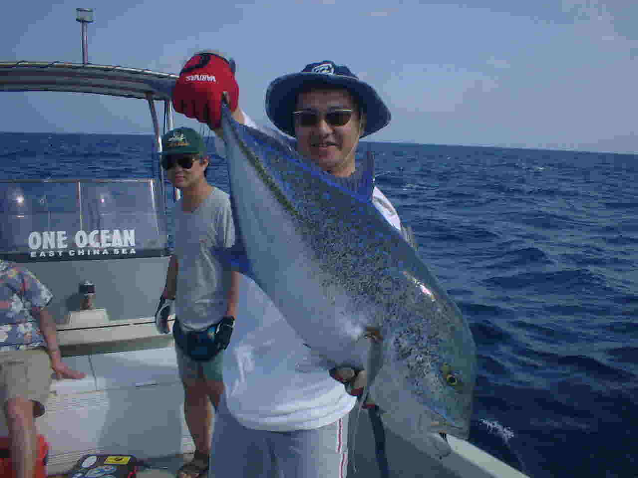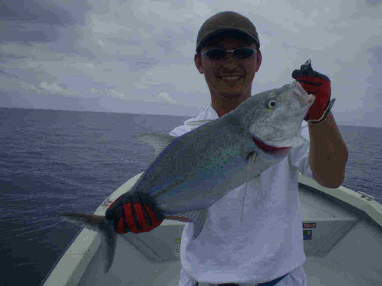 | 2日間のジグングチャーター。 1日目天気も凪、オガン回りでジギングスタート。 小潮回りだがいい感じに潮が走りベストだった。底物や3k青物(ツムブリ・カツオ)などの反応がよく、ほとんど入れ食い状態!! ジギング初挑戦の大熊さんは、おはまりモード。しかし狙いのイソマがこない。ツムブリをかけ上げていると、後ろには20k〜30k級のイソマが付いて来る。どうしても先にツムブリが釣れてしまう為、狙いをイソマに絞り350gのロングジグで攻める。何度かあたりがあったがフッキングならず。 しかしドラマは夕方の一流し、PE2,5号のライトロッドに強烈なアタリ、ファーストラン50mで魚が止まり、間違いなくイソマと確信し慎重にファイト、ゆっくり上げ出されては又巻きの攻防30分上がってきたのは、巨大GT40k・・・・・・うそ〜〜〜でかすぎる。ONEOCEAN TRICK62THでステラ6000に2,5号でGT40K。おめでとうございます。大熊さん!! 2日目は島周りでカンパチ狙い、カンパチ狙いでボウズなしと言う藤井さん。さすが仰るとおり、カンパチゲット。この日も夕方にドラマ?が。 おそらく10kクラスのカンパチをヒットさせ途中○ャー○アタッ○、いい所にかかったのか、そのまま1時間ファイト・・・・40mラインから全然上がってこない、最後すごいスピードでラインを出しブレークしました。 ほんとお疲れ様でした。 |