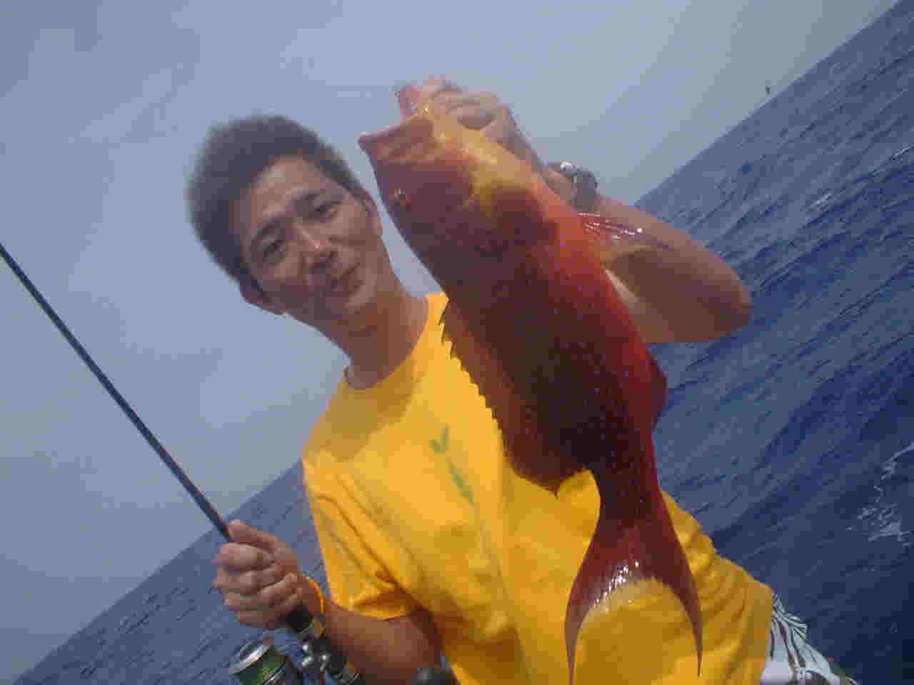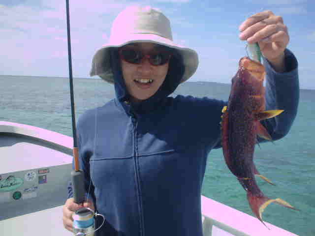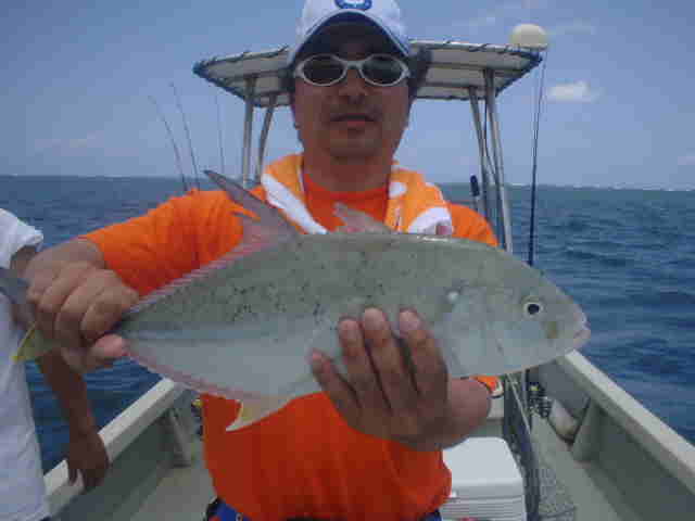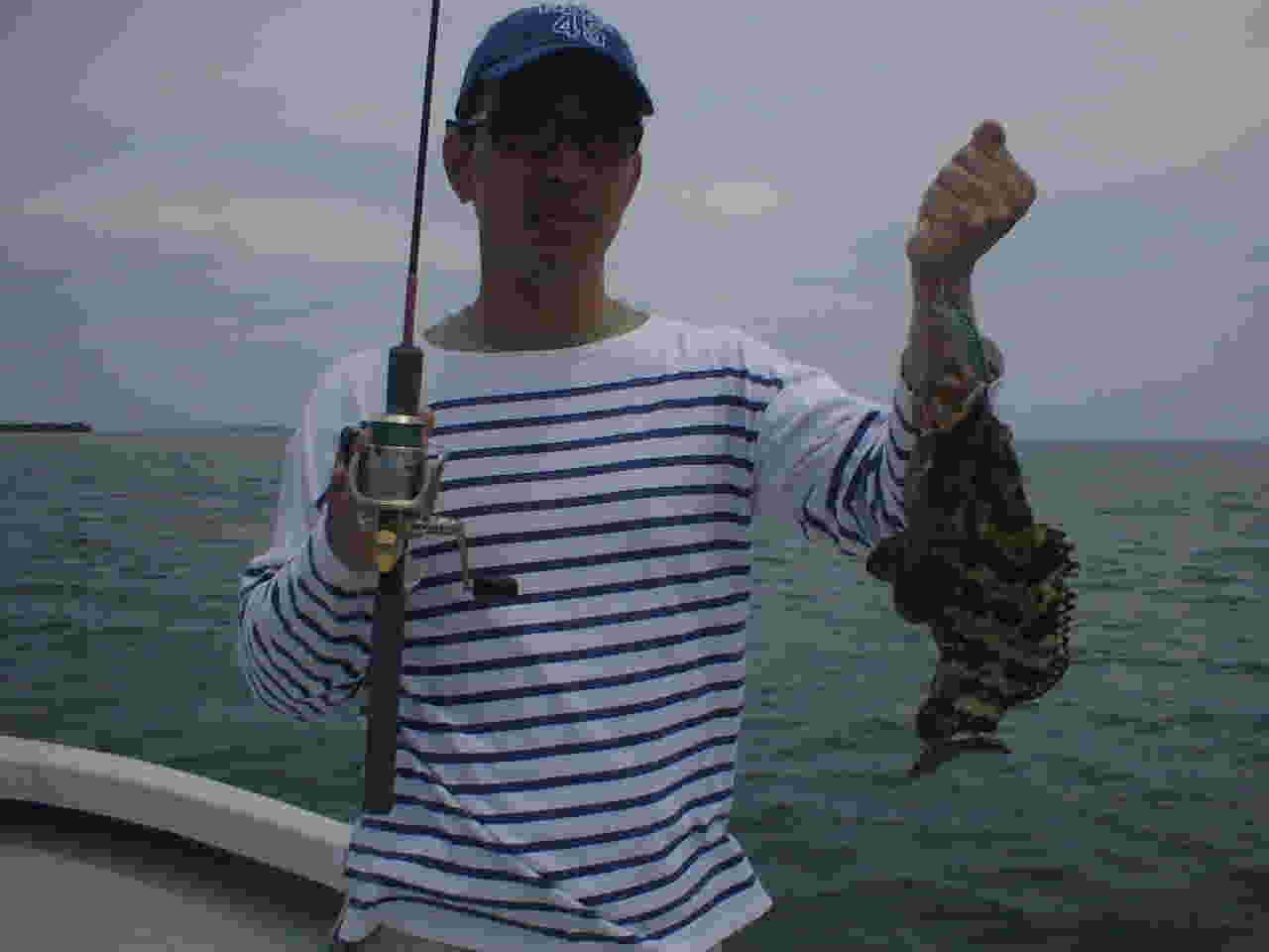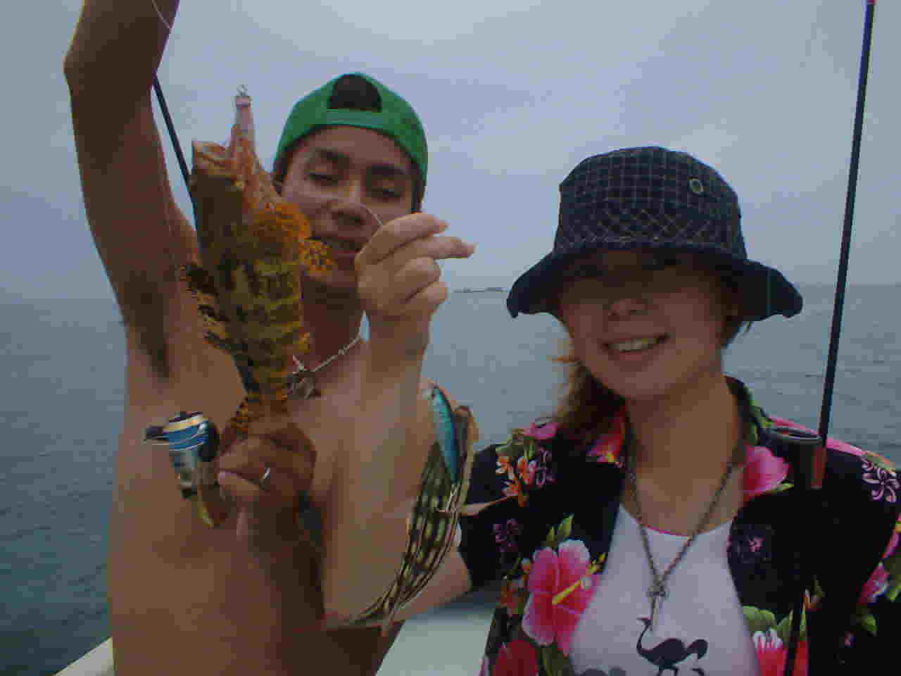 | 沖縄本島から新婚旅行。 本島でも釣りをするがルアーではまだ釣った事が無いという事。 なかなかルアーでは釣れないらしいですね。同じ沖縄なのに魚の数やサンゴの種類、海の綺麗さにすごい驚いていました。「これが沖縄さ〜〜」と、沖縄産まれの 方に言われると何だか複雑ですね〜〜。 |
