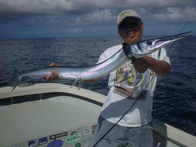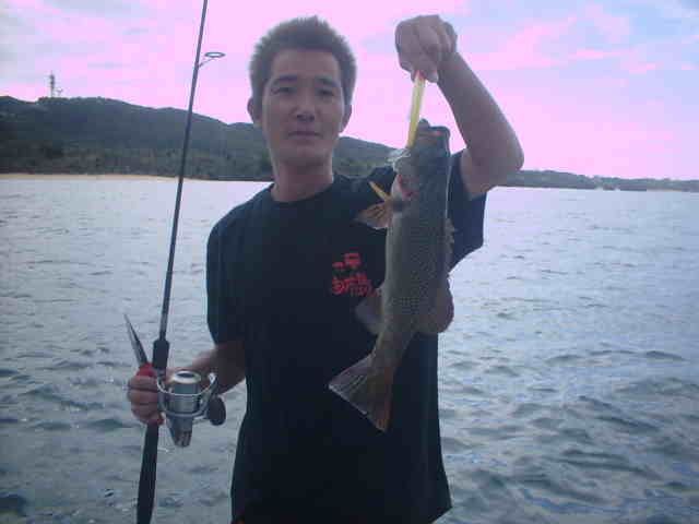 | 05秋ダサー西表釣行。 残念な事に台風19号通過で2日間海を中止・・・ うねりは残っているが、2日間ライトゲームを楽しんでいただいた。 西表に越して来て約半年の小野さんも一緒にダツ狙い。 さすが島在住は強いですね〜〜北村さんを尻目にダツゲット!! 北さん&ホッシーはダツ以外はどんどん釣れるのですが、 本命のダツが出るけどのらないパターンにはまり、ノーフィッシュ・・残念 |