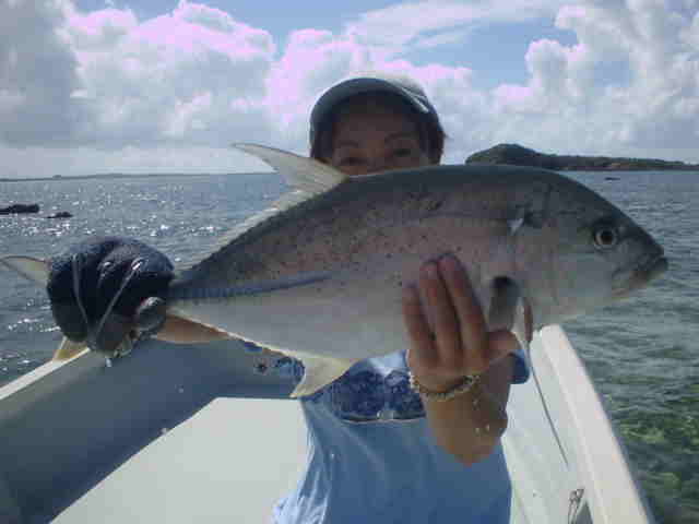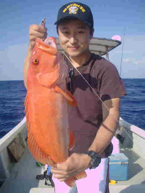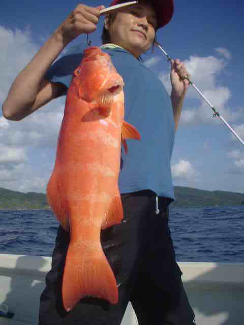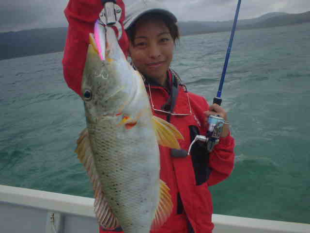 | ライトゲームのミニGT狙い。 昼の満潮なのでリーフ際を流しながら、ミニGTを狙う。 すぐに彼女に1kほどのGTがヒットし無事ランディング。 そして長嶋君はリーフではかけてはいけないサイズが ヒット、(10kぐらいかな)セルテートに巻いてあるライン 150mがみるみるなくなり、あと10mで止まった。 船で追いかけ巻き取るが何だか怪しい感じ、後をたどる様に 追いかけるとリーフの外まで走られており、スリットの中に 入り込んでいた。こうなったらどうにもならずあっけなくラインブレーク。 その後も2〜3kのミニGTを無事キャッチ。 ヒットルアー ドラドペンシル11F |