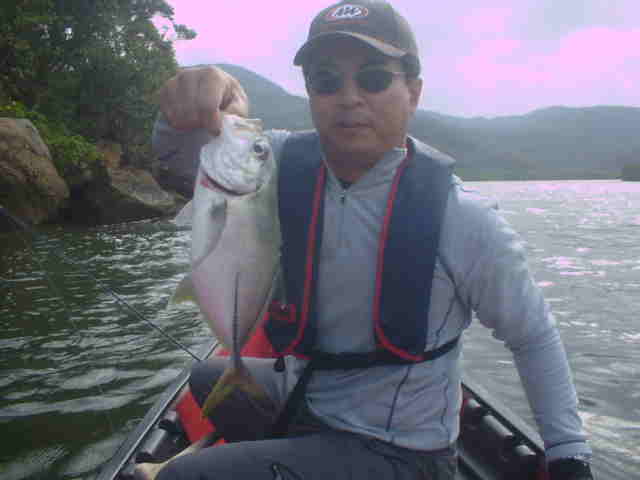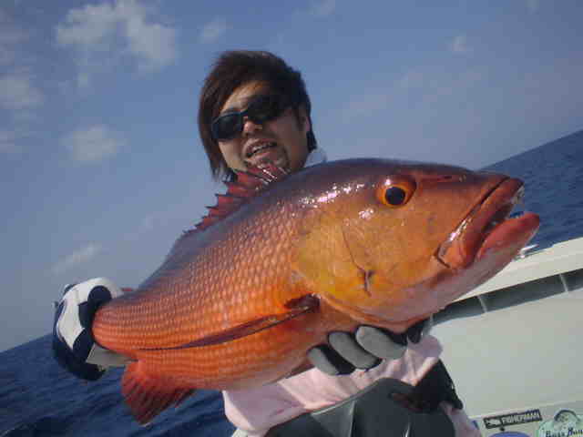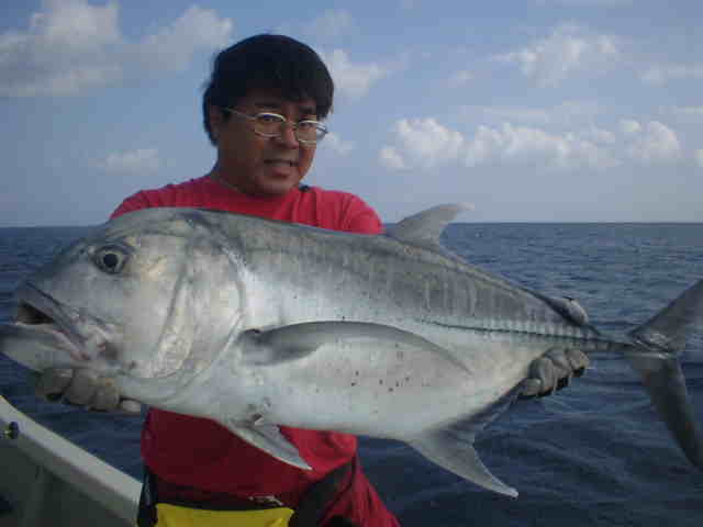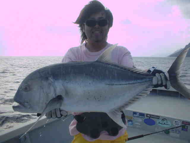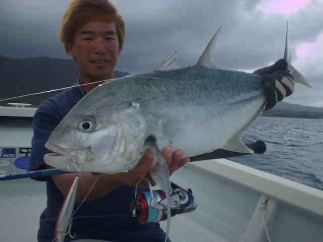 | ミーニシの季節風がきつく、波3m〜4m。 GTメインの釣行でしたが、天候不良で1日目は川へ。 キャストがなれるにつれ、チヌが面白いように釣れました 釣るのが夢だったユゴイも釣れ、戸田さんご満悦。 最終日ようやく海も落ち着きGT狙い、朝一でさわちゃん にGTがバイトしかしのらない。 風裏を選びながらポイントを移動したが夕方まで、GTらしきバイトはなし。夕方ここしかないと言うポイントでさわちゃんにGTヒット!!さすが西表では何匹も釣っているので、余裕のファイトで無事キャッチ。そして次は戸田さん。ルアーをキャストしてワンジャークでGTがヒット!! すかさずさわちゃんが戸田さんを支えに入りファイト。 慎重にポンピングして無事キャッチ。 これがファーストGTの戸田さん、おめでとうございます。 今度はサイズアップ、さわちゃんは目指せ30kGTだね |