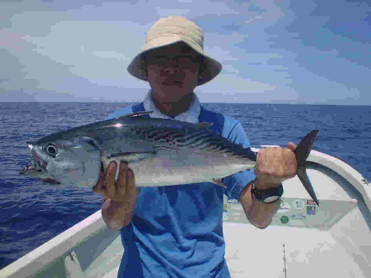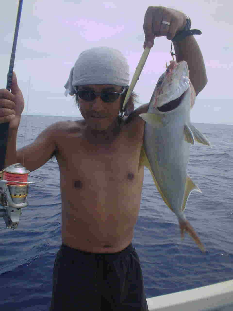 | 釣り好きファミリーの竹味様。 毎年西表に来て釣り三昧の毎日。 さすが皆さんお上手で、次から次えと釣り上げ何匹釣ったか 分からないくらいです。 しかしダブルヒットはあるもののトリプルがなかなか出来ない・・・ お父さん早く釣っての声に、あせったお父さんライントラブル・・・ 寂しそうな後姿のパパでした。 |