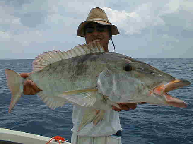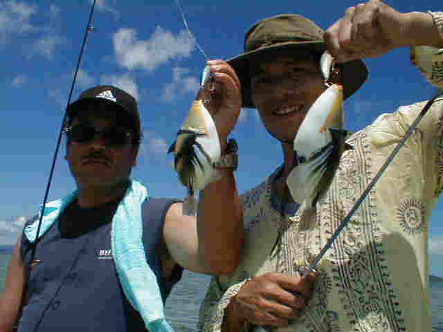 春先は水温が低いせいかイマイチ渋かったリーフのお魚達 ですが、今は絶好調アミメフエフキ、トップで入れ食いです。 |